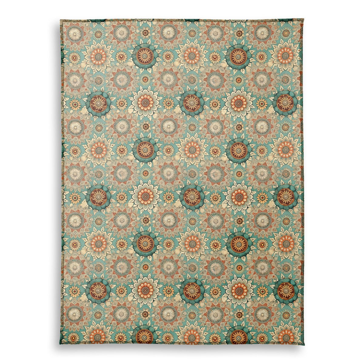 A vintage-style seamless pattern of intricate floral mandalas in a bohemian style. The design features a warm, earthy palette of orange, rust, and cream against a muted teal background, evoking the look of traditional block prints.