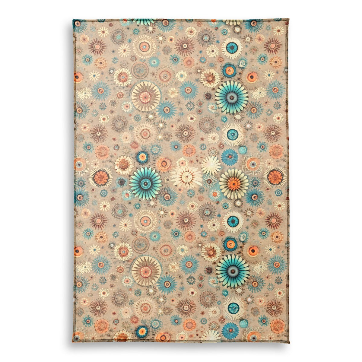 A dense, artistic collage of stylized flowers and circular motifs. The intricate designs feature a retro color palette of teal, orange, and earth tones against a textured background, creating a vibrant, bohemian-inspired pattern.