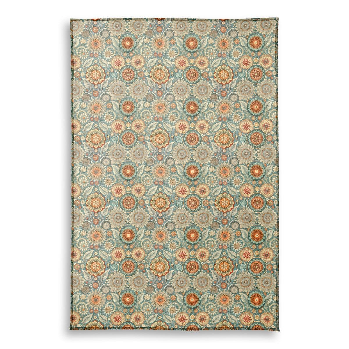 A vibrant, bohemian-style floral pattern featuring intricate, mandala-like flowers and stylized leaves. The rich color palette of teal, orange, and cream creates a warm, retro aesthetic on a dense, folk-art-inspired background.