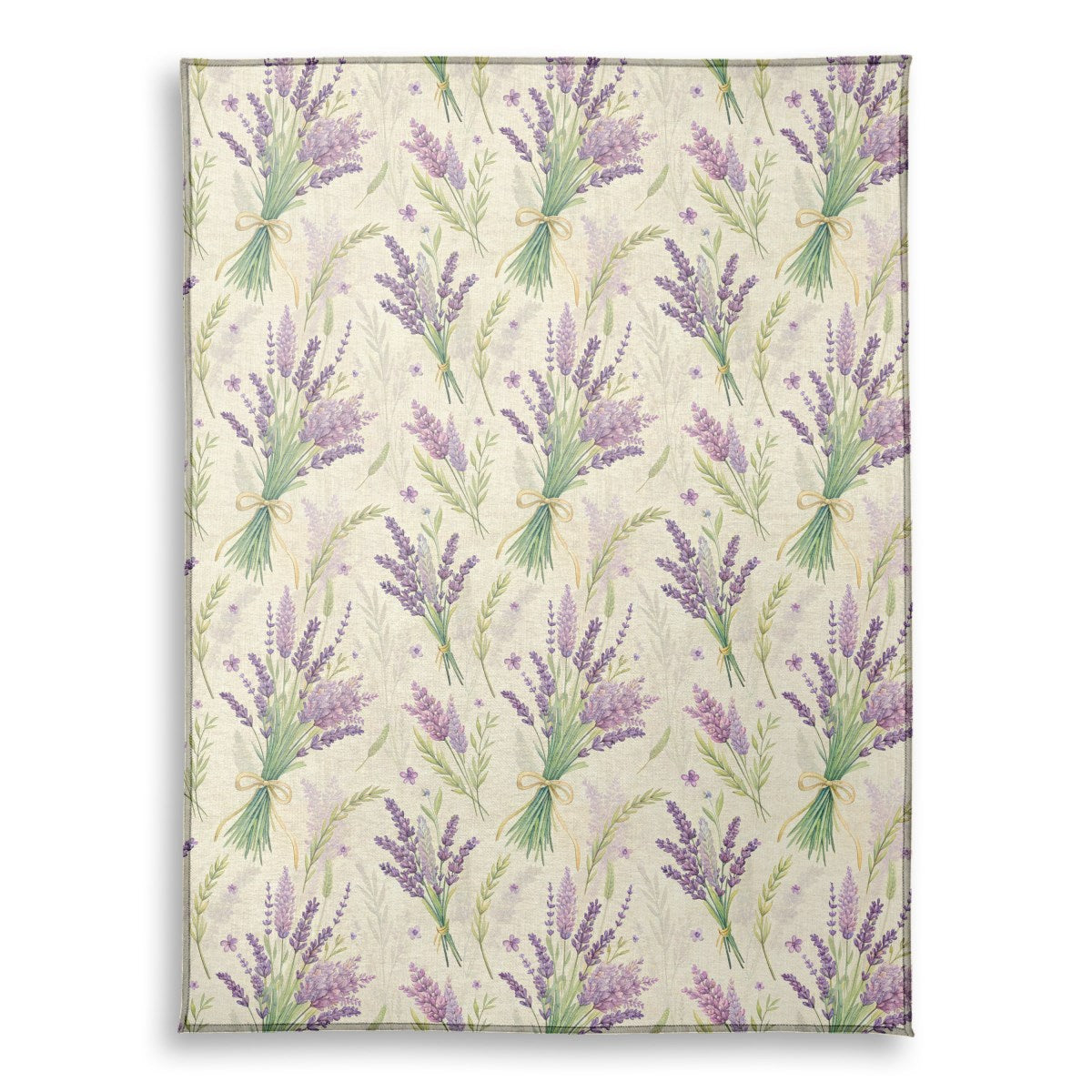 This is a watercolor-style botanical pattern of purple lavender. Bouquets and loose sprigs are scattered across a textured, light beige background. A prominent bunch tied with a yellow ribbon creates a central focus in this charming, rustic design.