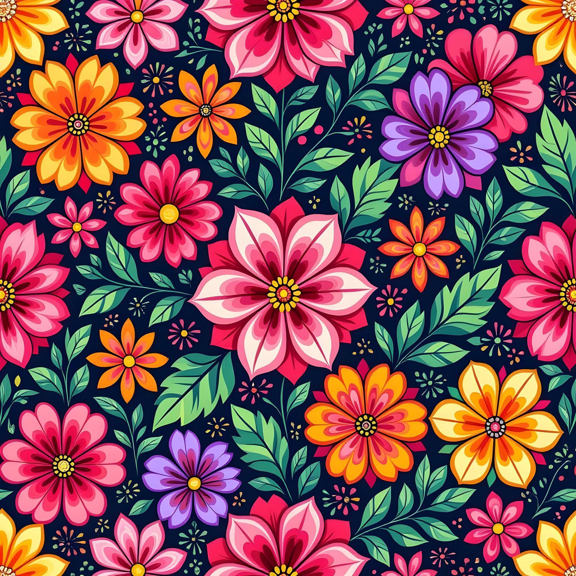 A vibrant, seamless pattern of stylized folk-art flowers. The bold, colorful blossoms in shades of pink, orange, and purple, along with green leaves, stand out against a dark navy background, creating a dense and cheerful composition.