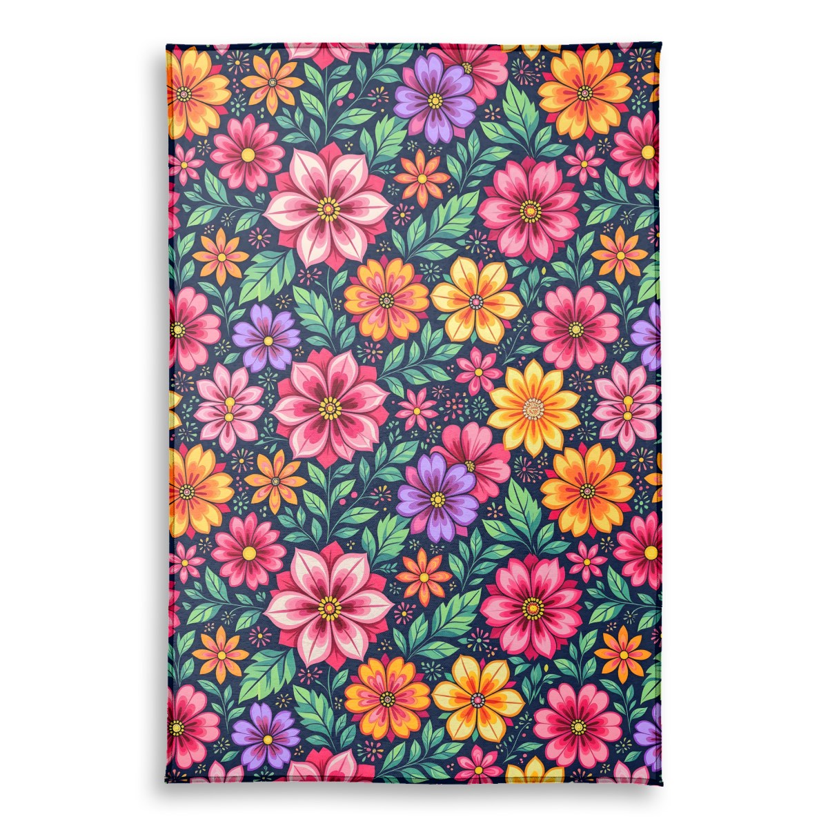 A vibrant, seamless pattern of stylized folk-art flowers. The bold, colorful blossoms in shades of pink, orange, and purple, along with green leaves, stand out against a dark navy background, creating a dense and cheerful composition.