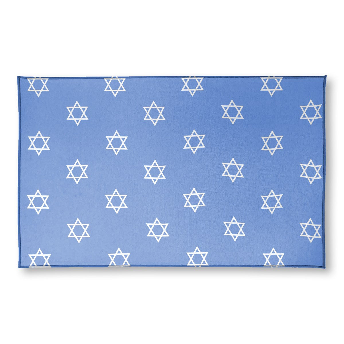 A seamless pattern features white Stars of David, a well-known symbol of Judaism, arranged in an orderly grid against a solid blue background.