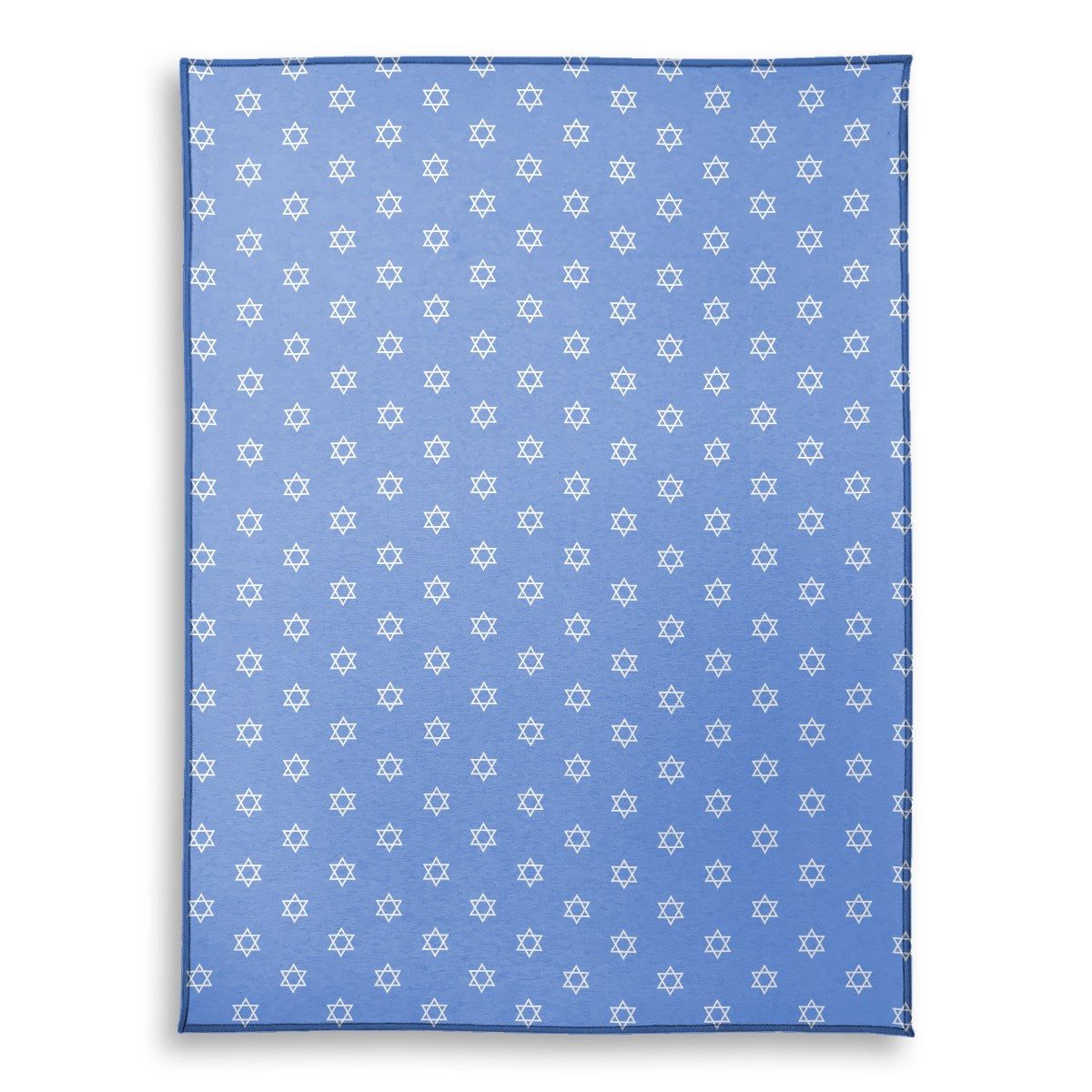 A seamless pattern features white Stars of David, a well-known symbol of Judaism, arranged in an orderly grid against a solid blue background.