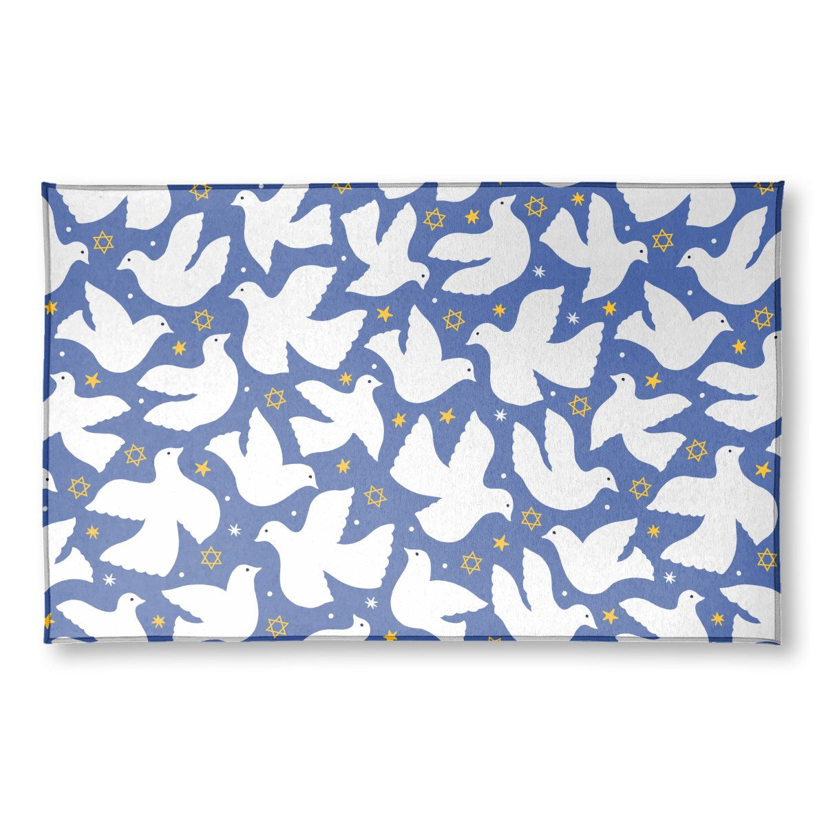 A seamless pattern of stylized white doves flying against a blue background. The design is scattered with yellow Stars of David and smaller stars, creating a symbolic and peaceful motif with Jewish themes.