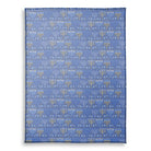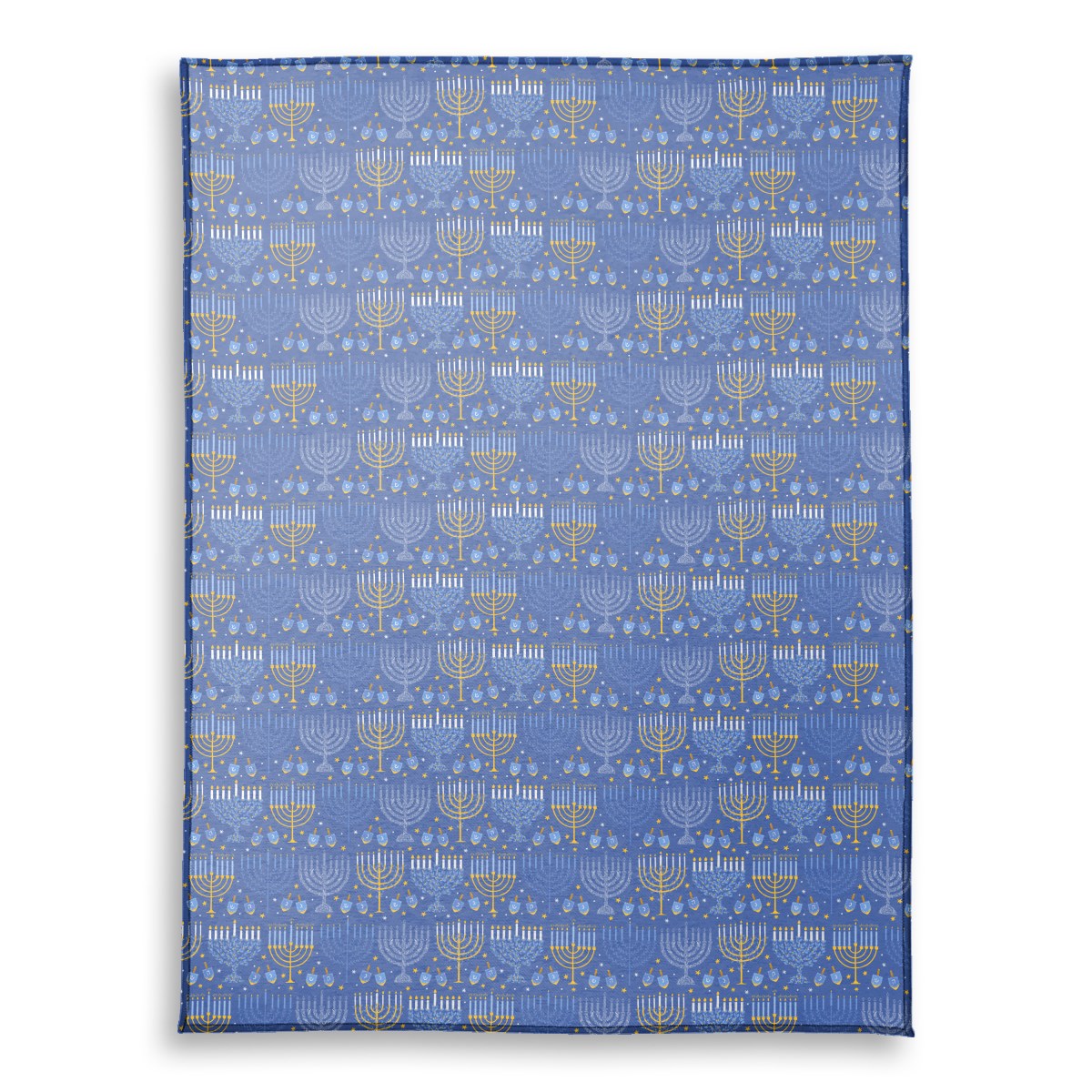 This is a festive, repeating Hanukkah pattern on a blue background. The illustration features various stylized menorahs, dreidels, lit candles, and stars in a cheerful color palette of blue, yellow, and white, celebrating the Jewish holiday.