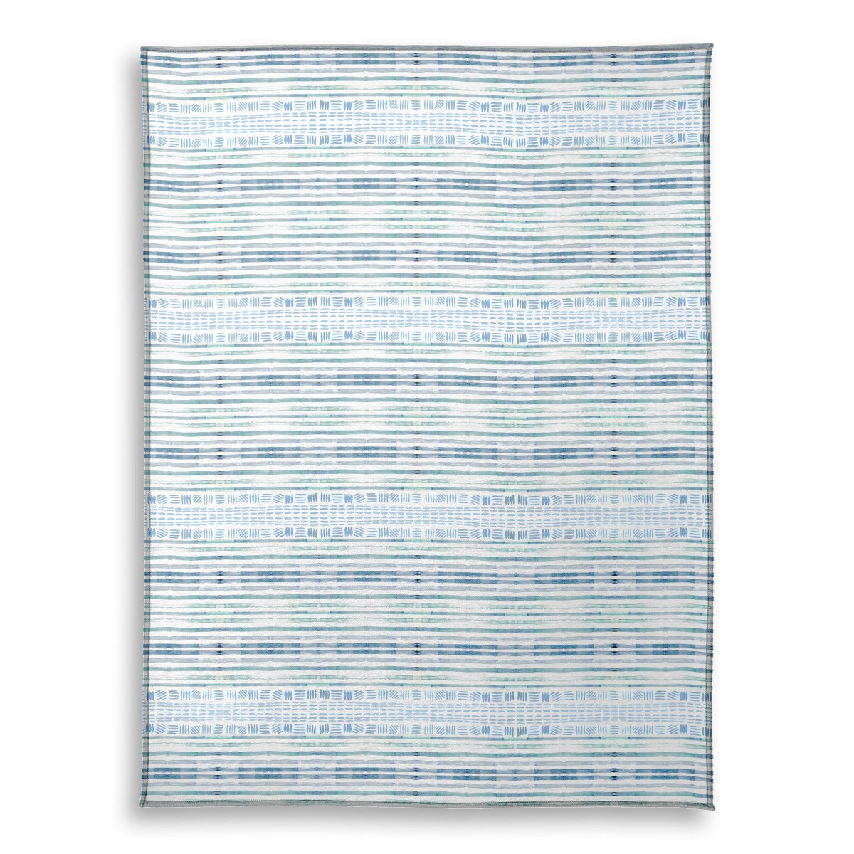 The image is a watercolor painting featuring a repeating pattern. The main design consists of broad horizontal stripes in varying shades of blue and teal, interspersed with thinner stripes of white. A central band displays a more intricate pattern of smaller, stylized shapes, including dashes, dots and small oblong forms, also in varying shades of blue. The overall effect is a harmonious blend of simple stripes and a more textured, almost tribal-inspired pattern. The color palette is cool and calming, emphasizing shades of blue and teal against a white background. The pattern is symmetrical, reflecting across both the horizontal and vertical axes.