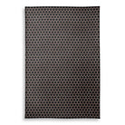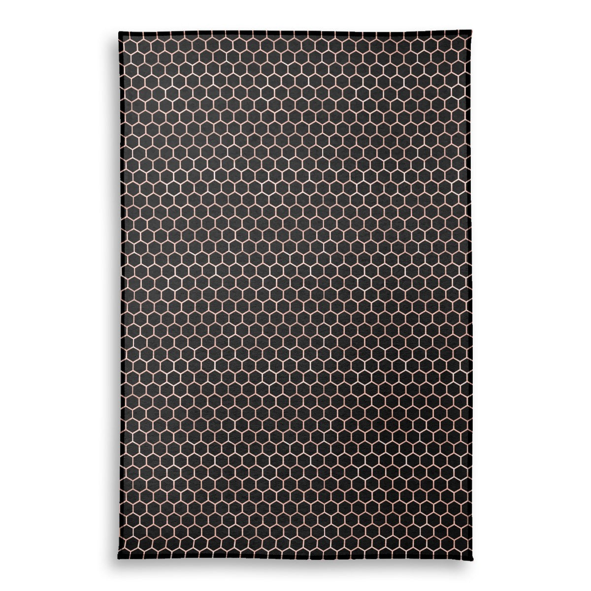 A seamless honeycomb pattern with thin, rose gold metallic lines creates a repeating grid of hexagons. The elegant, geometric design is set against a solid black background, producing a modern and striking contrast.