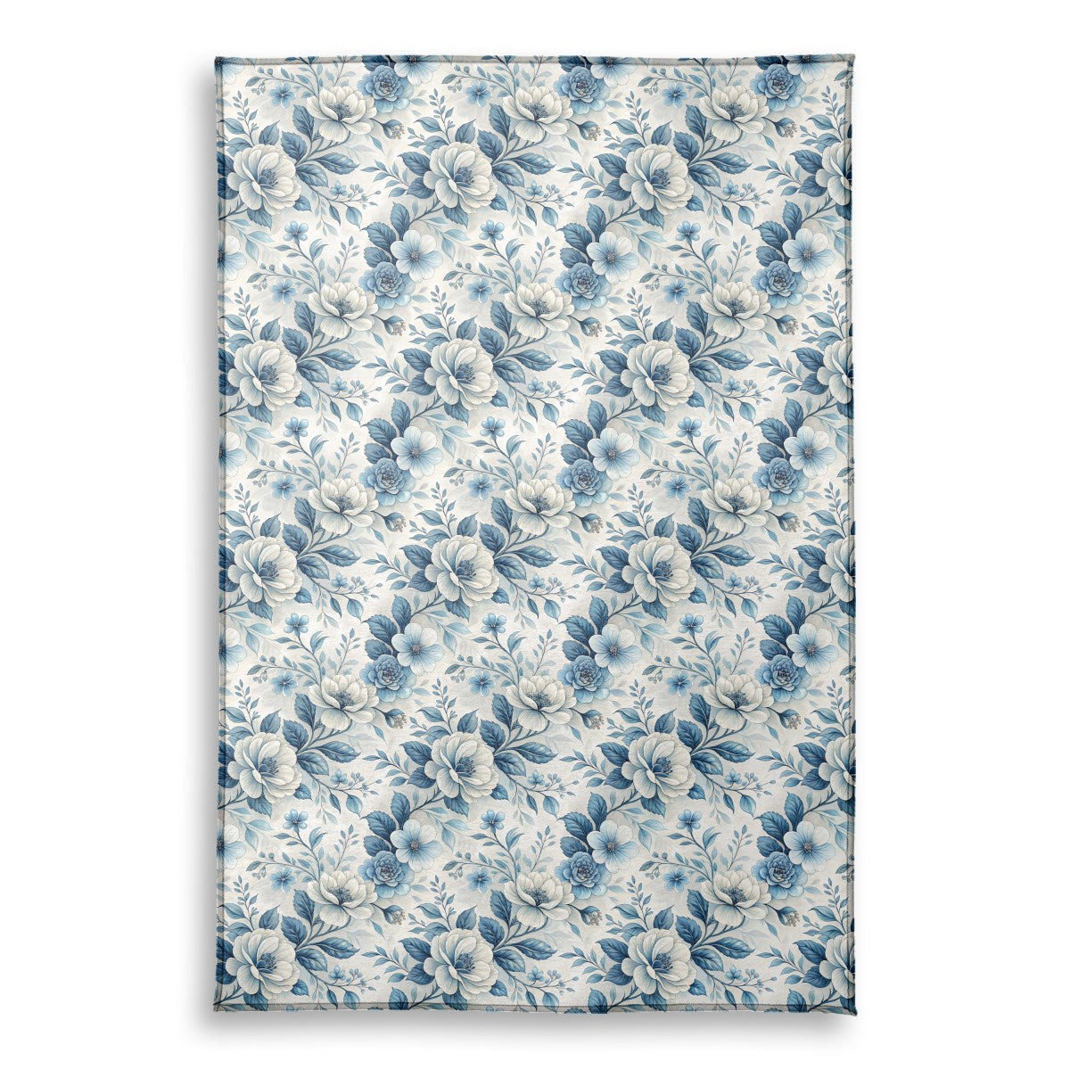 This is an elegant seamless pattern of blue and white flowers. Rendered in a delicate, watercolor-like style, the blossoms and dark blue leaves are set against a light, textured background, creating a classic and serene botanical design.