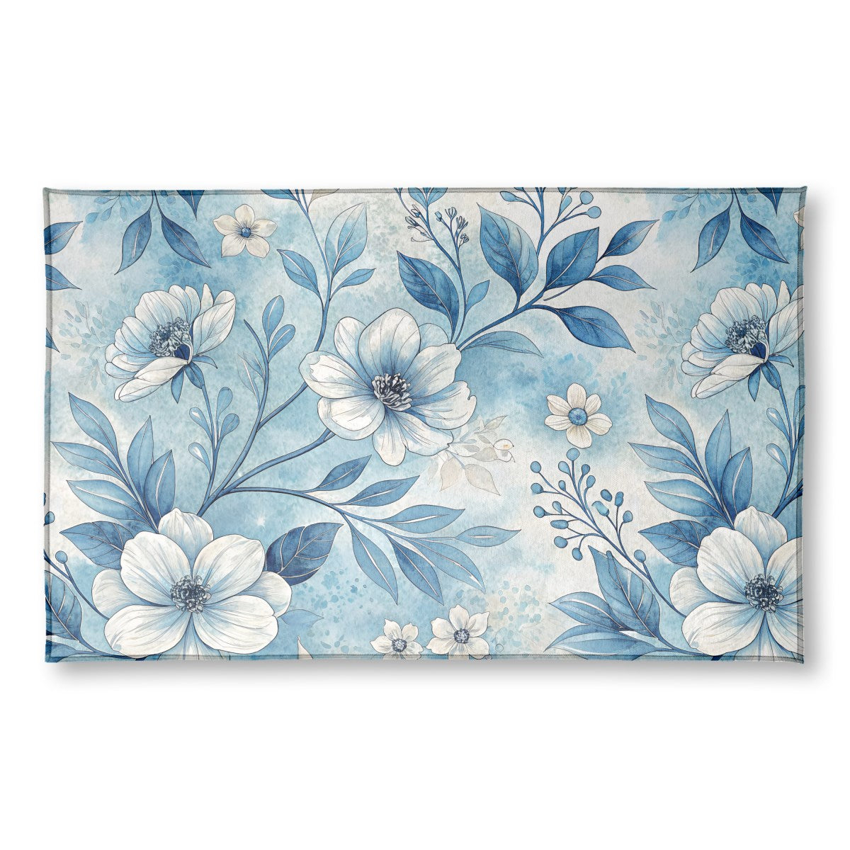 This watercolor illustration depicts a delicate floral pattern. White flowers with dark centers and deep blue leaves are intertwined on winding stems. The composition is set against a soft, mottled light blue background, creating a serene and elegant design.