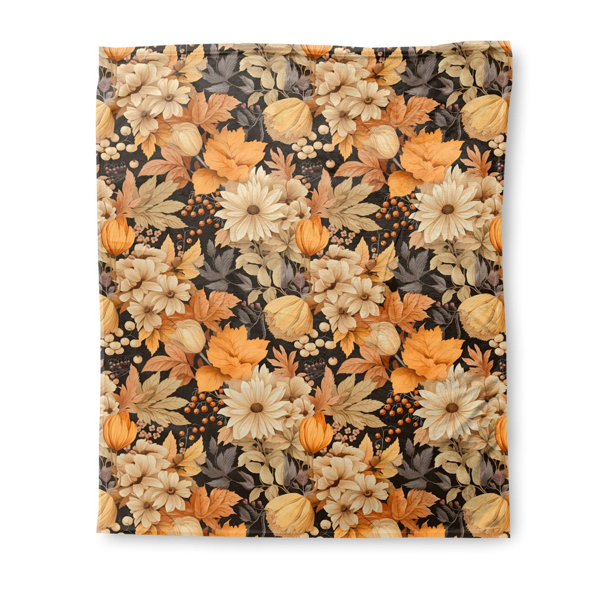 This is a seamless botanical pattern featuring autumn flora. A warm palette of orange, cream, and muted tones for flowers, leaves, and berries is set against a dark background, creating a rich, elegant, and vintage-inspired design with a cozy, autumnal feel.