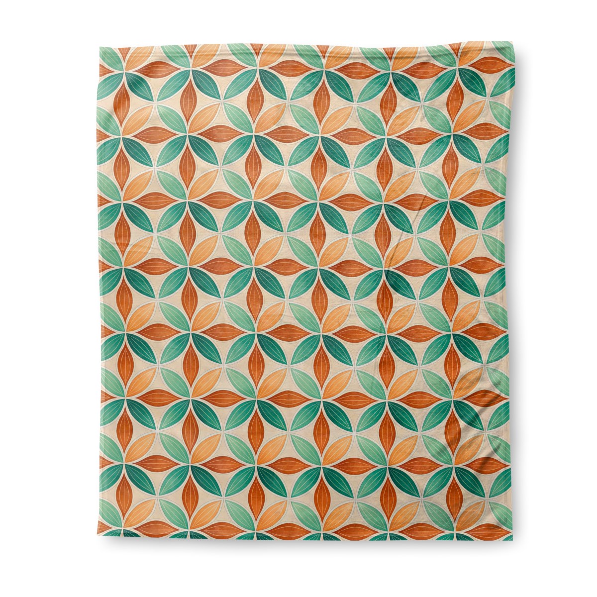 A retro geometric pattern featuring stylized flowers with alternating teal and terracotta-orange petals. The seamless design is set on a cream, textured background, creating the look of vintage ceramic tiles with a mid-century modern aesthetic.