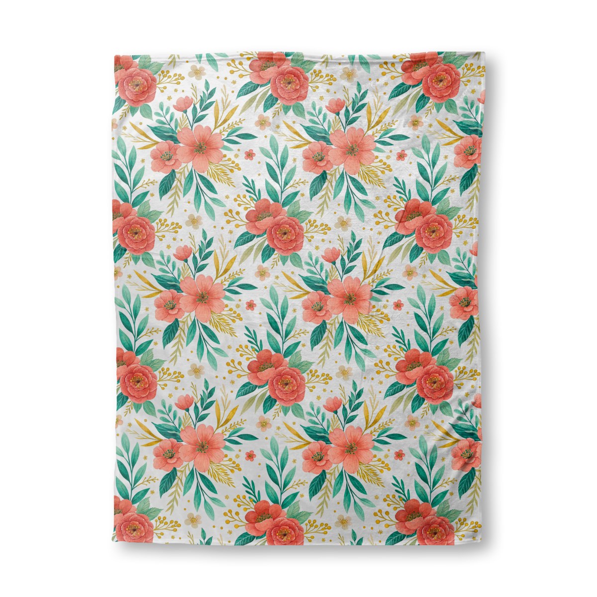 This is a vibrant watercolor floral pattern on a white background. The design features elegant coral-red flowers, teal-green and golden leaves, and delicate gold specks, creating a warm and sophisticated botanical illustration.
