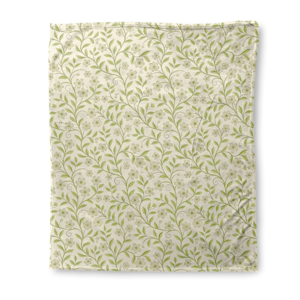 A delicate, vintage-style floral pattern featuring gracefully curving green vines and leaves on a cream background. The small white flowers have a distinctive, web-like texture on their petals, creating a charming and elegant design suitable for wallpaper or fabric.