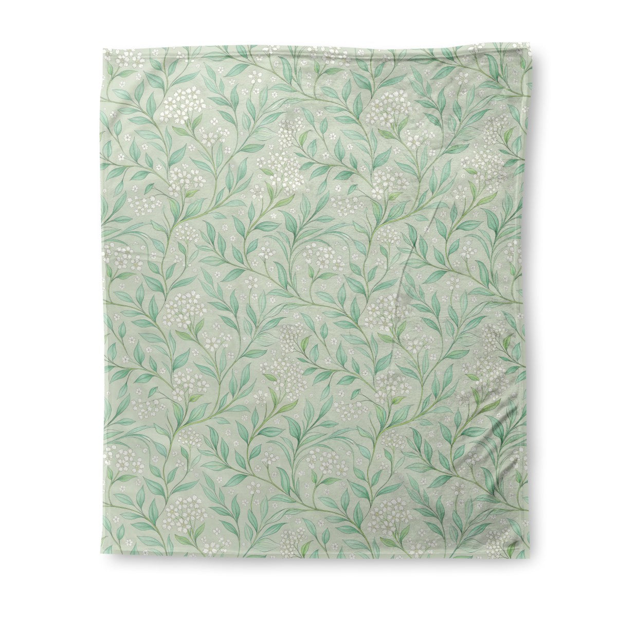 A serene, seamless botanical pattern of delicate white flowers and gracefully swirling green leaves. The elegant, illustrative design is set against a soft sage green background, creating a timeless and tranquil aesthetic with an Art Nouveau influence.