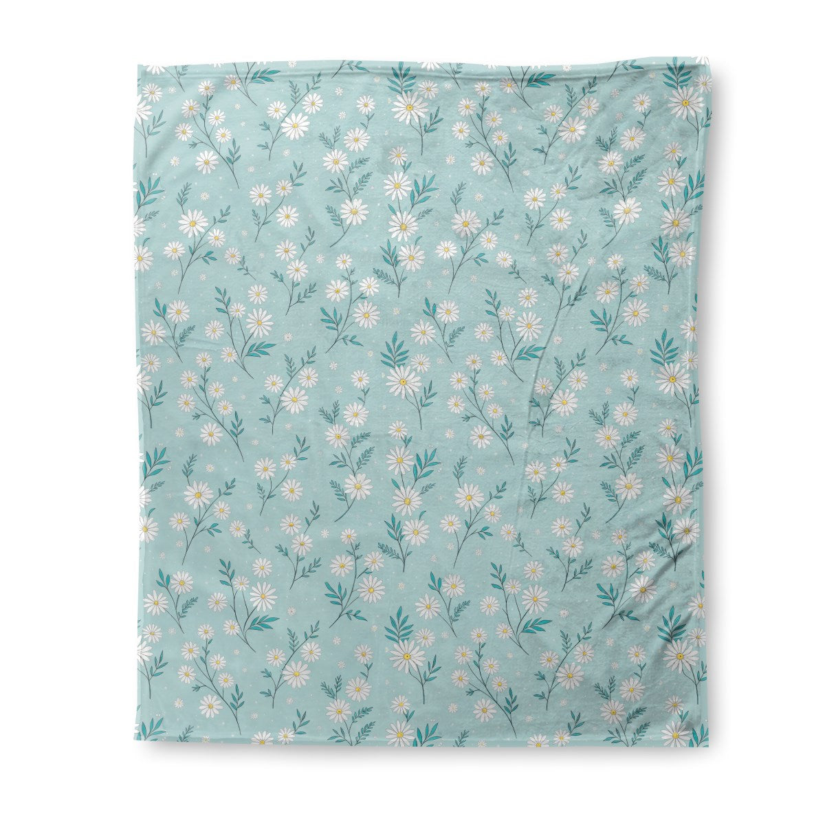 This is an illustrated, seamless pattern of delicate white daisies with yellow centers and teal leaves. The charming flowers are scattered across a speckled, light blue background, creating a fresh and whimsical design.