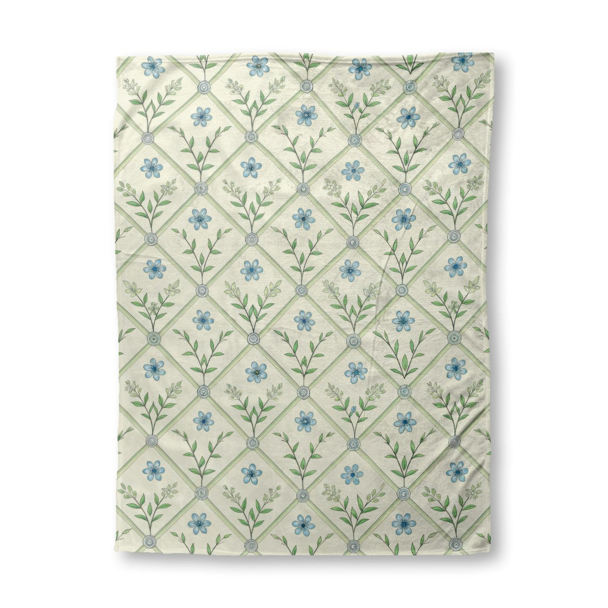 A seamless botanical pattern featuring a light green diagonal trellis on a cream background. The diamond shapes contain alternating motifs of a single blue flower and a leafy green sprig, creating a delicate, vintage-inspired design suitable for wallpaper or fabric.