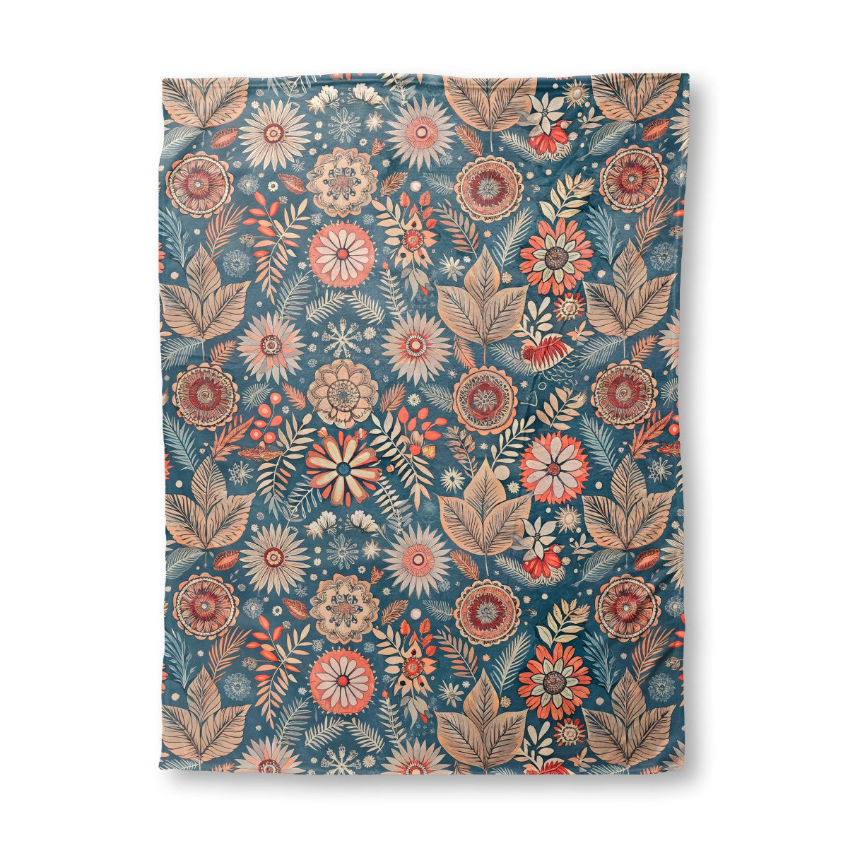 A dense, folk art-inspired pattern features stylized flowers, leaves, and ferns against a dark teal background. The illustration uses a warm, autumnal palette of rust, orange, and cream, creating a rich, vintage textile feel.