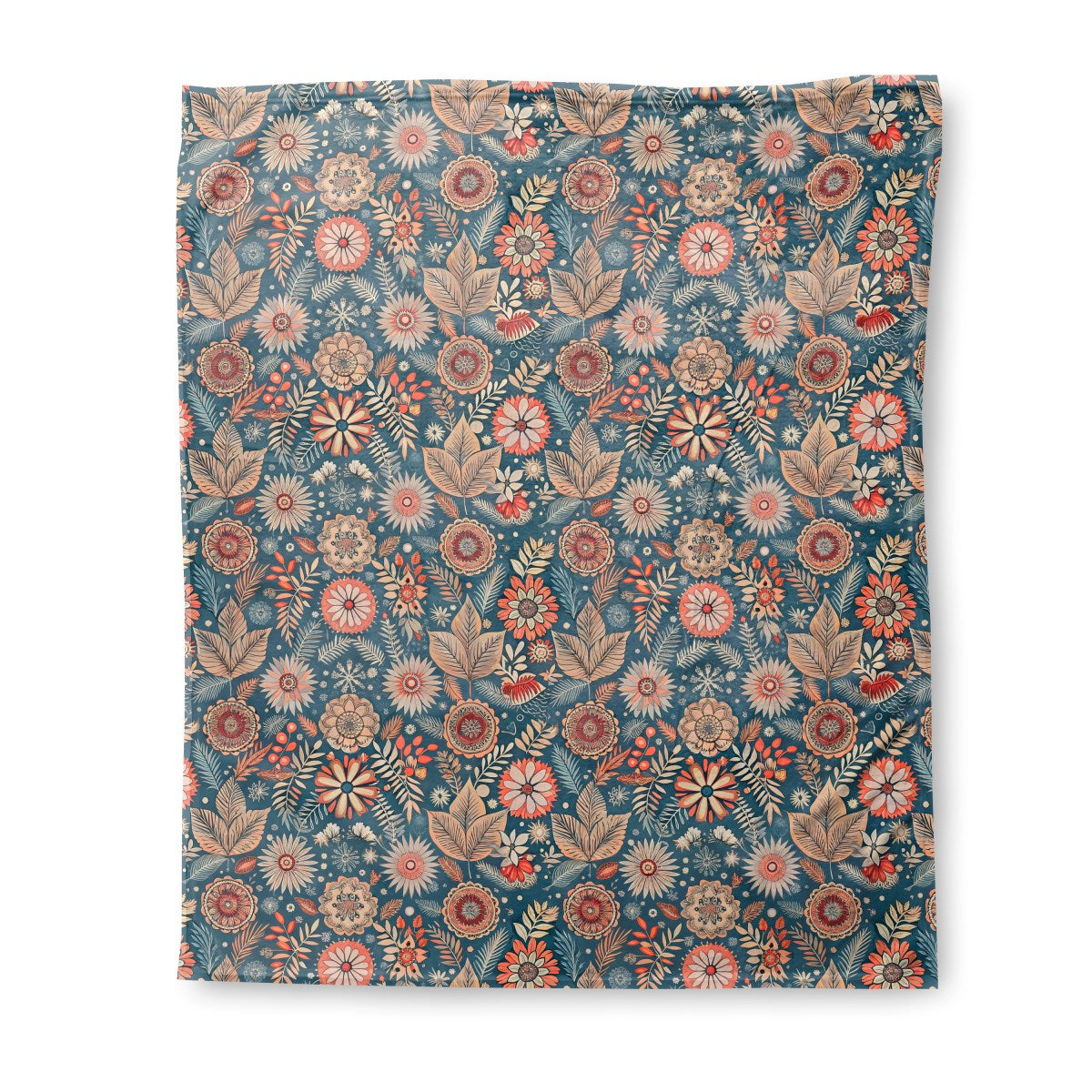 A dense, folk art-inspired pattern features stylized flowers, leaves, and ferns against a dark teal background. The illustration uses a warm, autumnal palette of rust, orange, and cream, creating a rich, vintage textile feel.