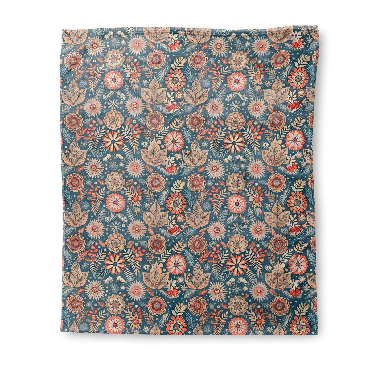 A dense, folk art-inspired pattern features stylized flowers, leaves, and ferns against a dark teal background. The illustration uses a warm, autumnal palette of rust, orange, and cream, creating a rich, vintage textile feel.