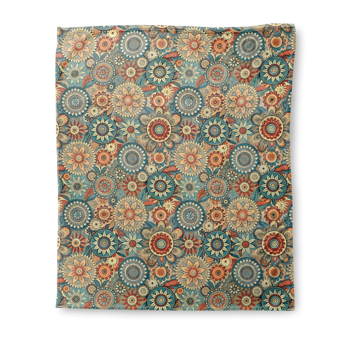 A dense, bohemian-style pattern of intricate, hand-drawn mandalas and stylized flowers. The collage-like design uses an earthy color palette of teal, orange, and cream, creating a vintage, folk-art feel.