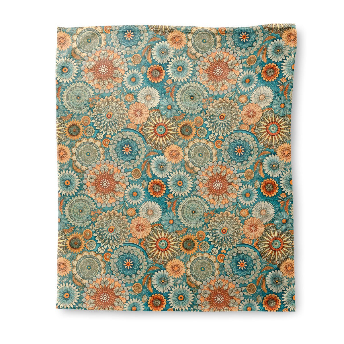 This is a vibrant, bohemian-style pattern featuring intricate, overlapping flowers and mandalas. The dense composition uses a striking color palette of teal, orange, and cream, creating a detailed and retro design with a folk-art aesthetic.