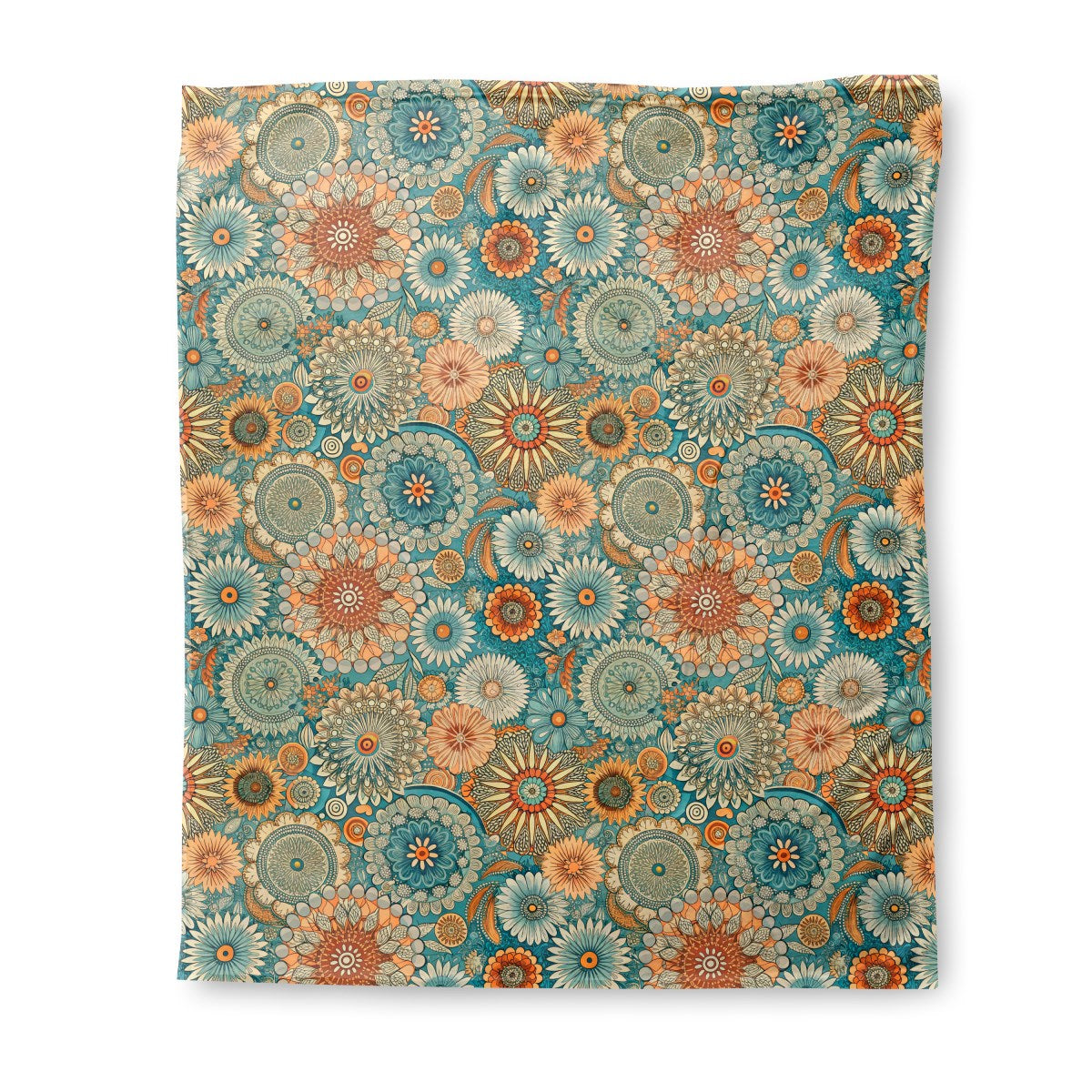 This is a vibrant, bohemian-style pattern featuring intricate, overlapping flowers and mandalas. The dense composition uses a striking color palette of teal, orange, and cream, creating a detailed and retro design with a folk-art aesthetic.
