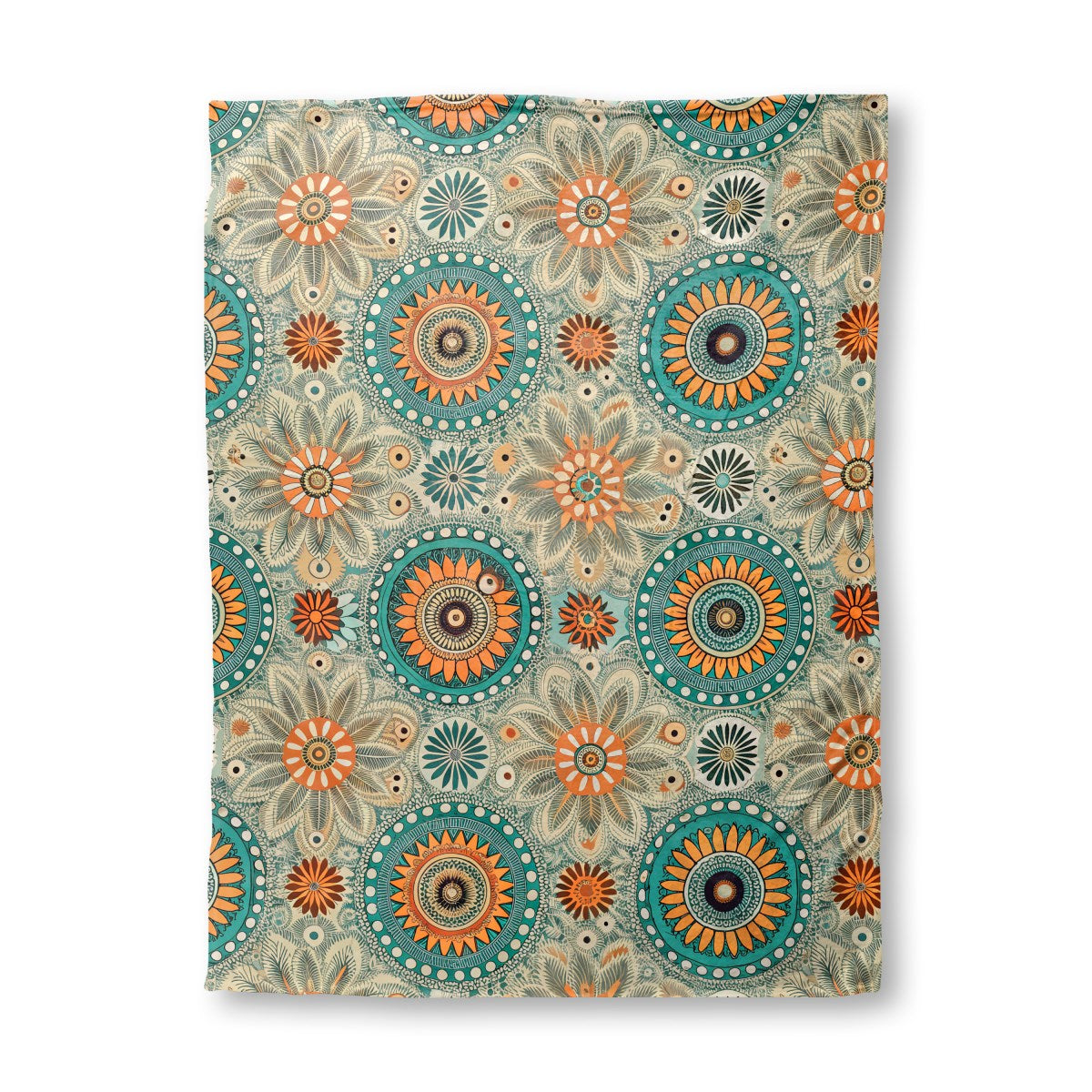 This is a vibrant, repeating pattern featuring intricate mandalas and stylized flowers in a bohemian, folk-art style. The design uses a striking color palette of teal, orange, and cream, with detailed line work and dotted textures creating a rich, layered effect.