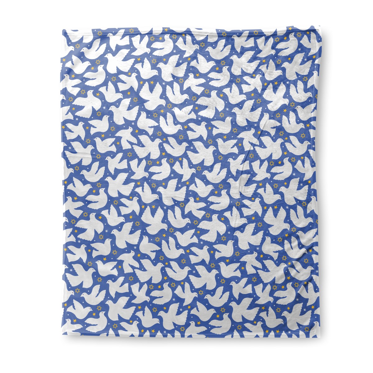 A seamless pattern of stylized white doves flying against a blue background. The design is scattered with yellow Stars of David and smaller stars, creating a symbolic and peaceful motif with Jewish themes.