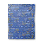 This is a festive, repeating Hanukkah pattern on a blue background. The illustration features various stylized menorahs, dreidels, lit candles, and stars in a cheerful color palette of blue, yellow, and white, celebrating the Jewish holiday.