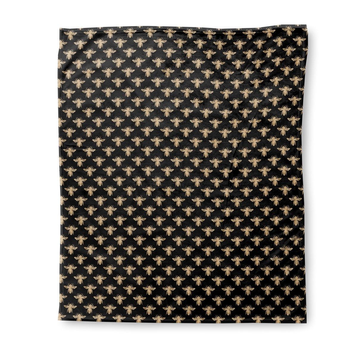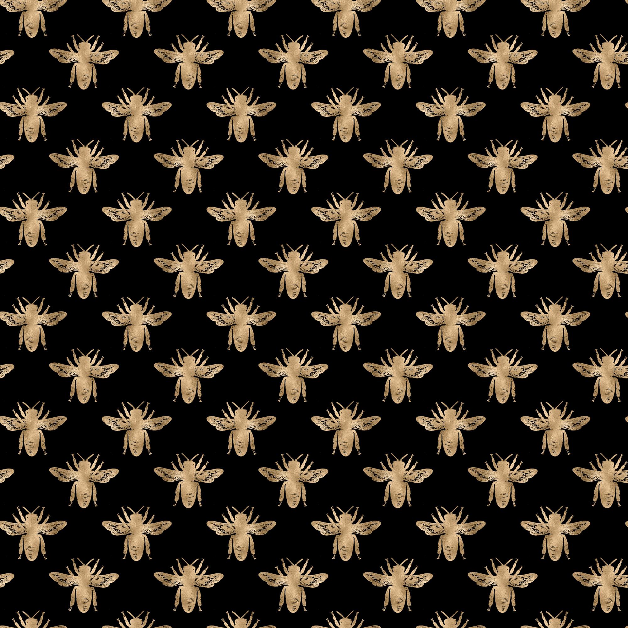 A repeating pattern of stylized golden bees with a metallic, textured finish is arranged in a uniform grid against a solid black background. The contrast creates a striking, elegant, and decorative design.