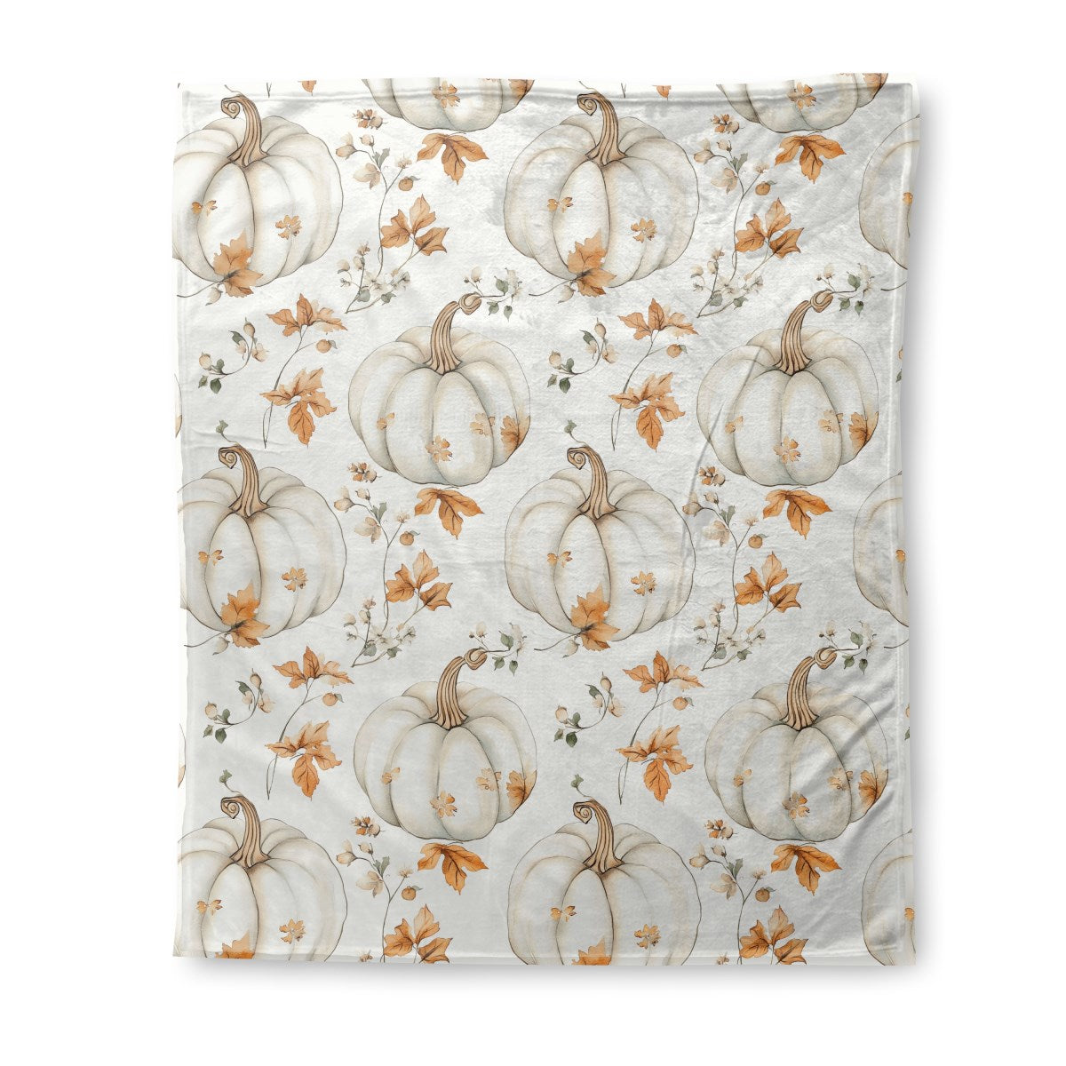 This is a delicate watercolor pattern featuring elegant white pumpkins. The design is interspersed with rustic brown autumn leaves, small white flowers, and trailing vines on a clean background, creating a soft and sophisticated fall aesthetic.