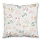 A seamless pattern of stylized, hand-drawn rainbows in a muted, earthy color palette. The minimalist design features shades of pink, brown, and green on a light, neutral background, creating a gentle, bohemian aesthetic suitable for wallpaper or textiles.