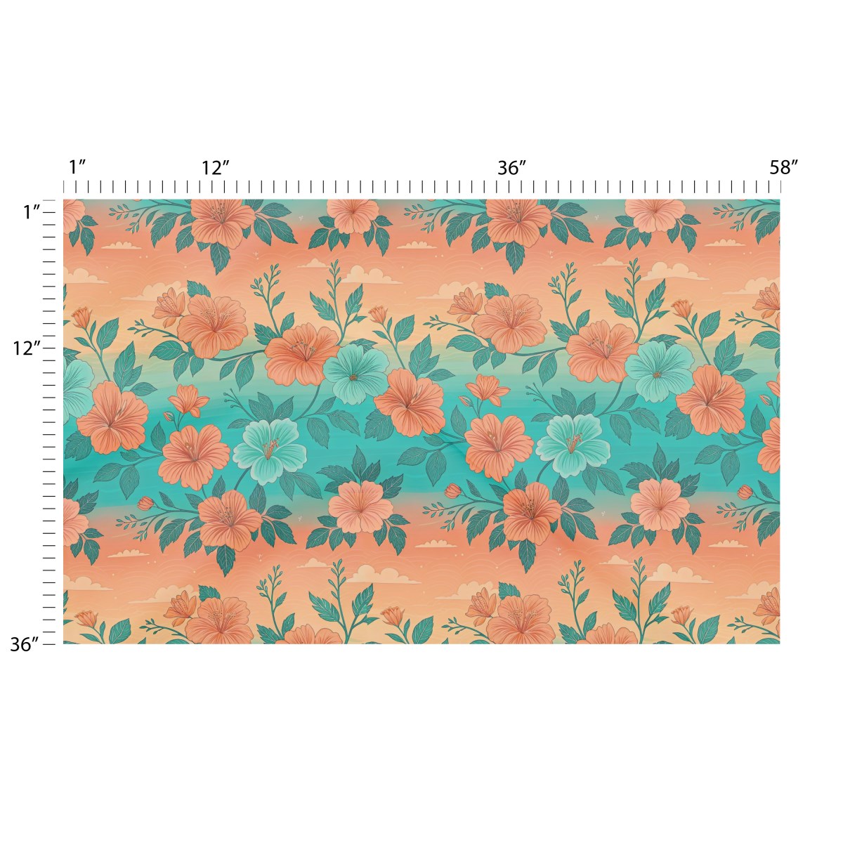 A vibrant, retro-style pattern of orange and teal hibiscus flowers with dark green leaves. The background is a stylized sunset gradient, shifting from warm orange to cool turquoise, with subtle clouds creating a serene, tropical atmosphere.