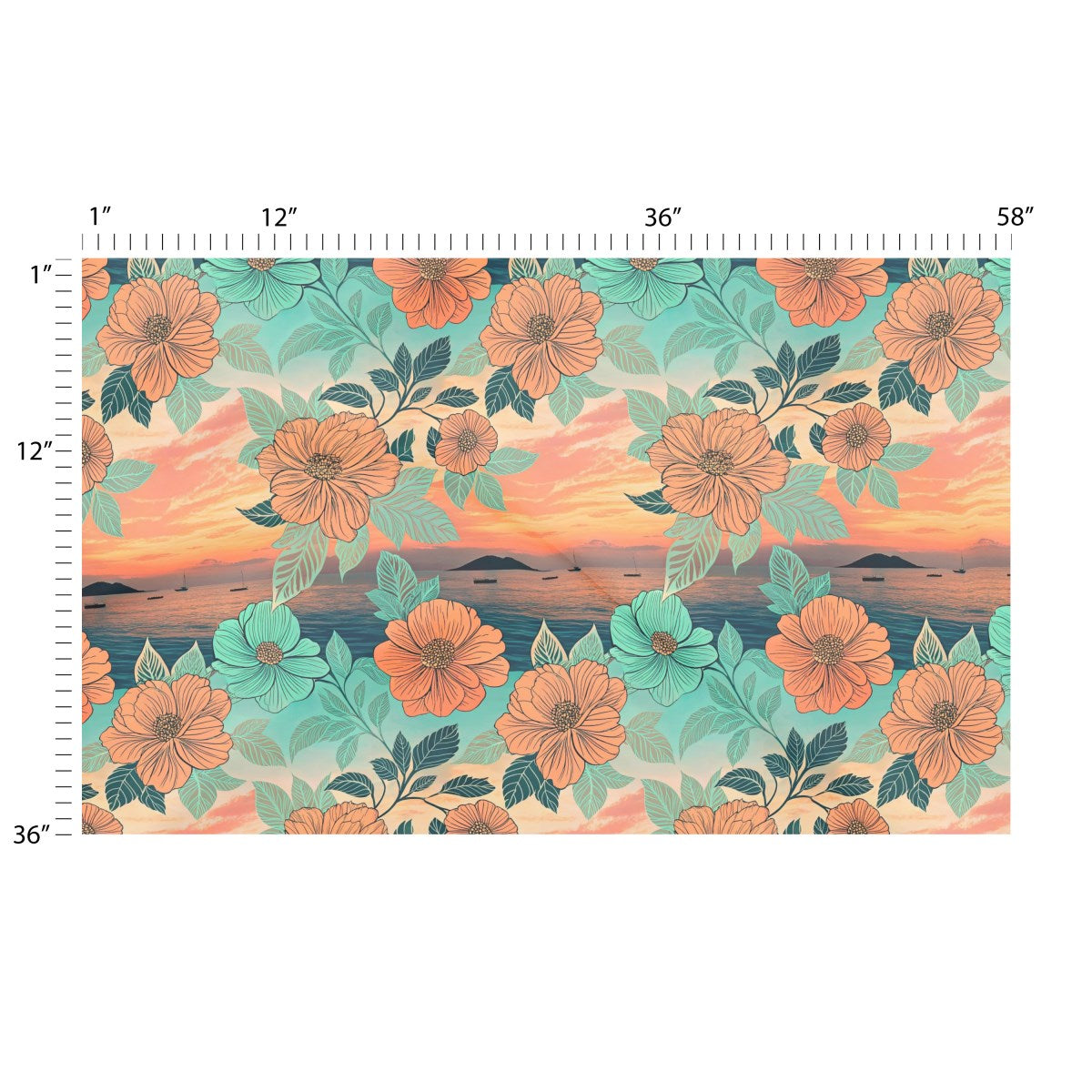 This composite image blends a stylized floral pattern with a realistic ocean sunset. Bold orange and turquoise flowers are overlaid on a serene seascape featuring sailboats and distant islands under a vibrant, cloudy sky, creating a unique artistic collage.