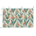 A stylized, seamless pattern of tropical flora. Vibrant orange Bird of Paradise flowers and large, teal-green leaves are illustrated against a light, textured background with muted beige foliage, creating a lush, vintage-inspired design.