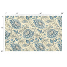 An elegant, traditional floral pattern featuring large, detailed blue and cream peonies. The flowers are interwoven with scrolling grey and blue vines on a dotted, pale yellow background, creating a sophisticated, vintage-inspired design suitable for textiles or wallpaper.