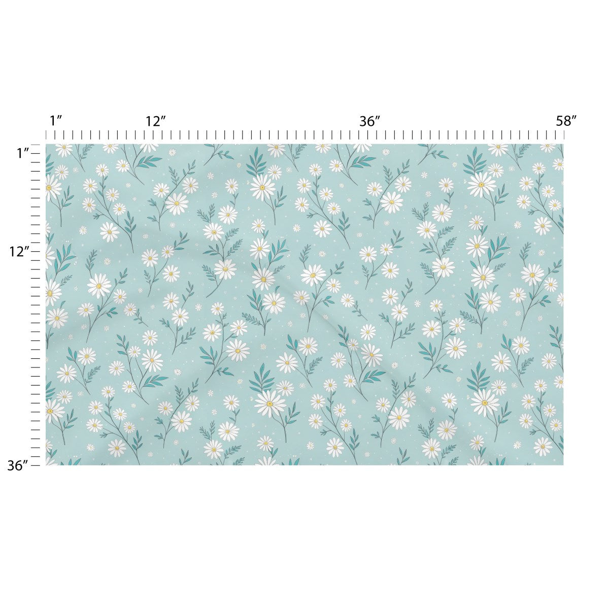 This is an illustrated, seamless pattern of delicate white daisies with yellow centers and teal leaves. The charming flowers are scattered across a speckled, light blue background, creating a fresh and whimsical design.