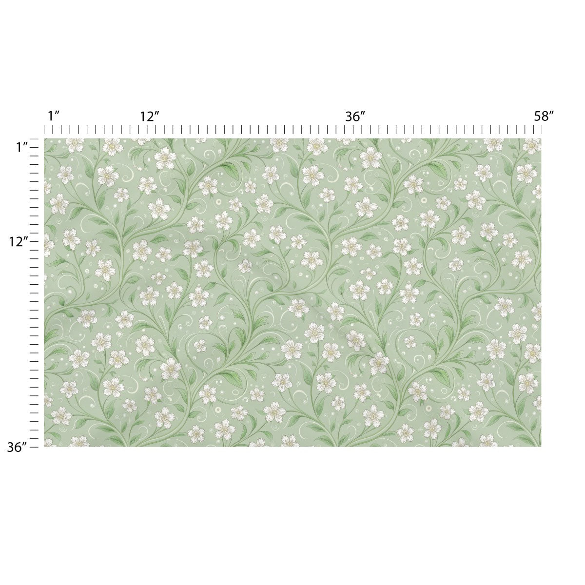 A vintage-style seamless pattern featuring delicate white flowers on gracefully swirling green vines. The intricate, elegant design is set against a soft, muted sage green background with subtle decorative swirls, creating a classic and serene composition.