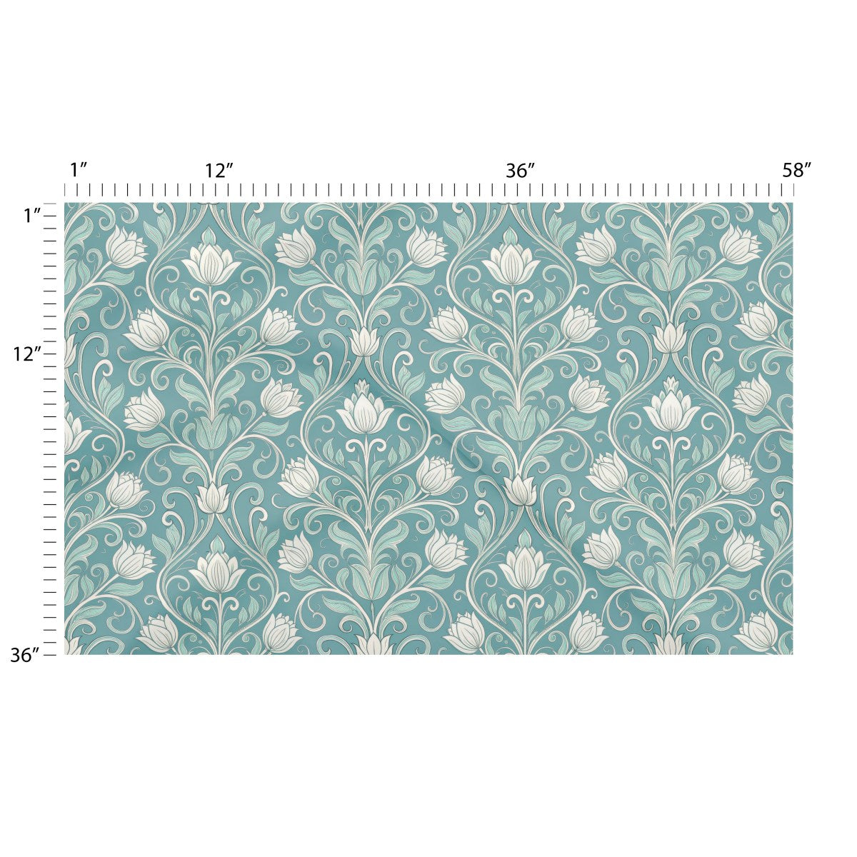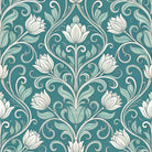 An elegant, symmetrical floral pattern in the Art Nouveau style. Stylized white and mint-green flowers are connected by swirling vines on a rich teal background, creating an intricate and decorative design reminiscent of vintage wallpaper.