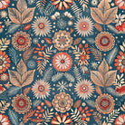 A dense, folk art-inspired pattern features stylized flowers, leaves, and ferns against a dark teal background. The illustration uses a warm, autumnal palette of rust, orange, and cream, creating a rich, vintage textile feel.