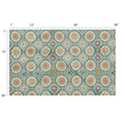 A vibrant, bohemian tile pattern features intricate sun and floral mandalas. The detailed orange, cream, and beige motifs are set within ornate diamond shapes on a rich teal background, creating a decorative, folk-art feel.