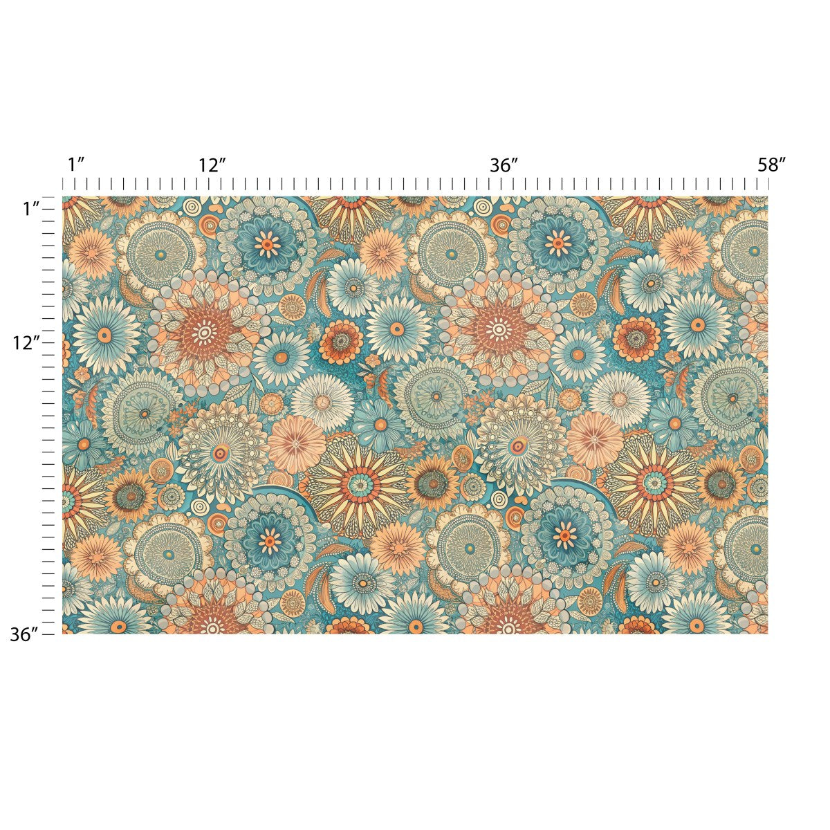 This is a vibrant, bohemian-style pattern featuring intricate, overlapping flowers and mandalas. The dense composition uses a striking color palette of teal, orange, and cream, creating a detailed and retro design with a folk-art aesthetic.