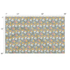 A repeating pattern of stylized flowers in yellow, pink, white, and pale blue on a muted gray-green background. Each flower features a dark blue center with white polka dots, creating a charming and whimsical design with a retro feel.