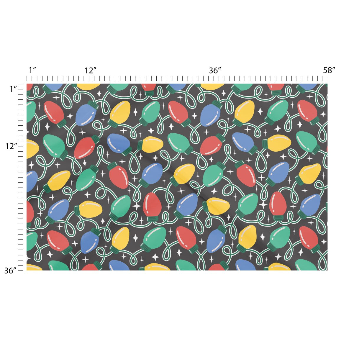 A festive, repeating pattern of colorful Christmas lights. The red, blue, green, and yellow bulbs are strung on looping white wires against a black background. White sparkles add a touch of magic to the cheerful, retro-style holiday design.