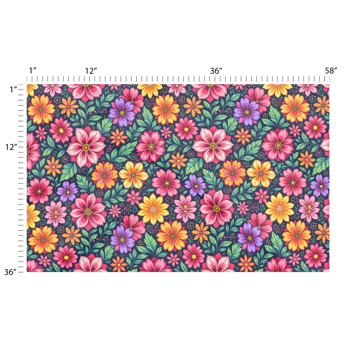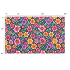 A vibrant, seamless pattern of stylized folk-art flowers. The bold, colorful blossoms in shades of pink, orange, and purple, along with green leaves, stand out against a dark navy background, creating a dense and cheerful composition.