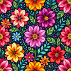 A vibrant, seamless pattern of stylized flowers in a folk art style. Bold, colorful blossoms in shades of pink, orange, and purple pop against a dark navy background, intertwined with green leaves to create a dense and cheerful composition.