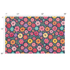 A vibrant, seamless pattern of stylized, colorful flowers in shades of pink, red, orange, and purple. The cheerful blossoms and green leaves pop against a dark navy-blue background, creating a dense and lively folk-art-inspired design.