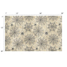This vintage-style illustration features an intricate, repeating pattern of black spiderwebs on a textured, parchment-like background. Two detailed spiders are present, one crawling on a web and another dangling from a thread, creating a classic spooky or Halloween-themed design.