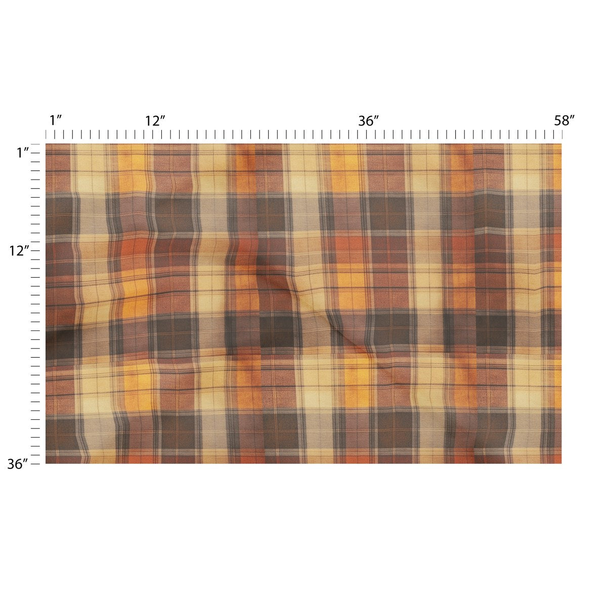 A close-up of a textured plaid fabric in a warm, autumnal color palette. The classic tartan pattern features intersecting stripes of brown, orange, mustard yellow, and beige, creating a cozy and rustic look.